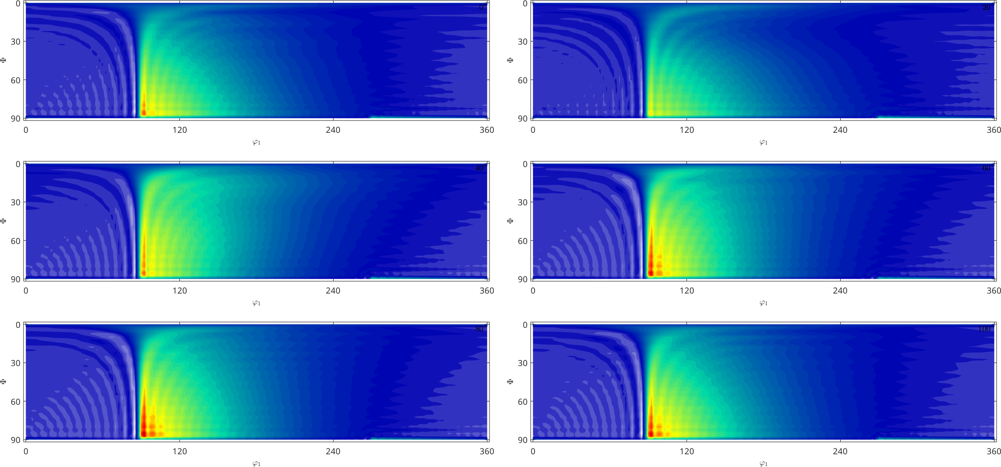 If \(\bf{\hat f}_1, \bf{\hat f}_2, \bf{\hat f}_3, \bf{\hat f}_4, \bf{\hat f}_5\) and \(\bf{\hat f}_6\) would be the column vectors of the Fourier-coefficients of the functions above, internally they would be stored in \(\hat F\) as follows. \[ \hat F(:, :, 1) = \pmatrix{\bf{\hat f}_1 & \bf{\hat f}_2 & \bf{\hat f}_3} \quad\mathrm{and}\quad \hat F(:, :, 2) = \pmatrix{\bf{\hat f}_4 & \bf{\hat f}_5 & \bf{\hat f}_6}. \]