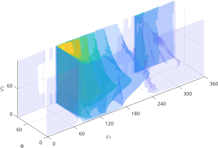 f = @(rot) [exp(rot.a+rot.b+rot.c)+50*(rot.b-cos(pi/3)).^3.*(rot.b-cos(pi/3) > 0), rot.a, rot.b, rot.c];Now we call the quadrature command to get (4x1) SO3F3 of type SO3FunHarmonic